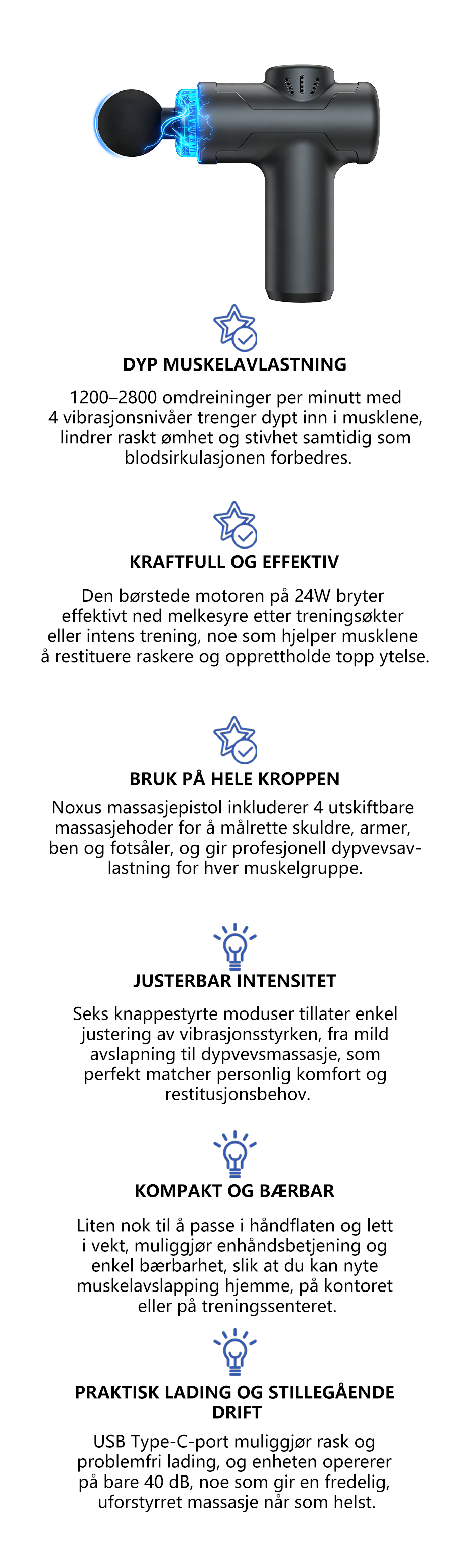 Noxus leveres med fire utskiftbare massasjehoder som er utviklet for hele kroppen – fra nakke og skuldre til armer, ben og til og med fotsåler. Enten det er for restitusjon etter trening, lange arbeidsdager eller daglig avslapning, gir hvert tilbehør målrettet og effektiv lindring.