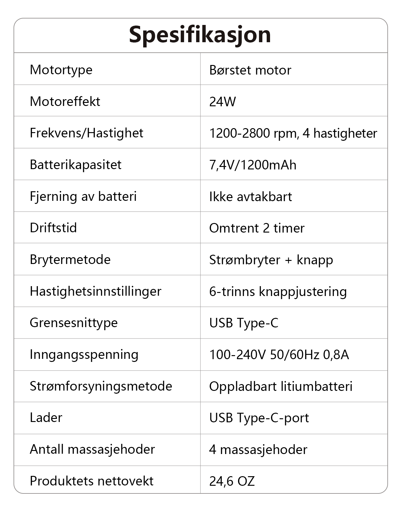 Med seks justerbare hastigheter fra 1200 til 2800 o/min kan du tilpasse intensiteten nøyaktig etter kroppens behov. Enten det gjelder oppvarming før trening, restitusjon etter økten eller avslapning etter en lang dag, gir hvert nivå en perfekt balanse mellom kraft og komfort.