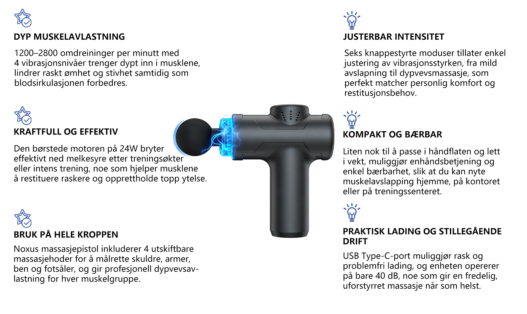 Utstyrt med en høytytende 24 W-motor leverer Noxus opptil 2800 slag per minutt for kraftig og jevn muskelstimulering. Den løser opp dype spenninger, myker opp muskelknuter og gjenoppretter bevegelighet etter intensive treningsøkter eller lange arbeidsdager. Hver impuls er jevn, kraftig og designet for å vekke musklene fra innsiden.