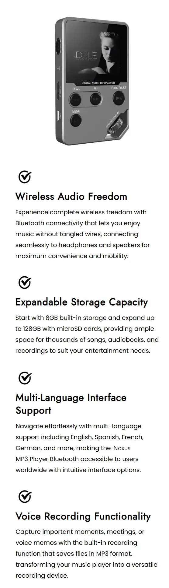 Noxus MP3 Player Connect effortlessly with Bluetooth 5.0 for high-quality audio.